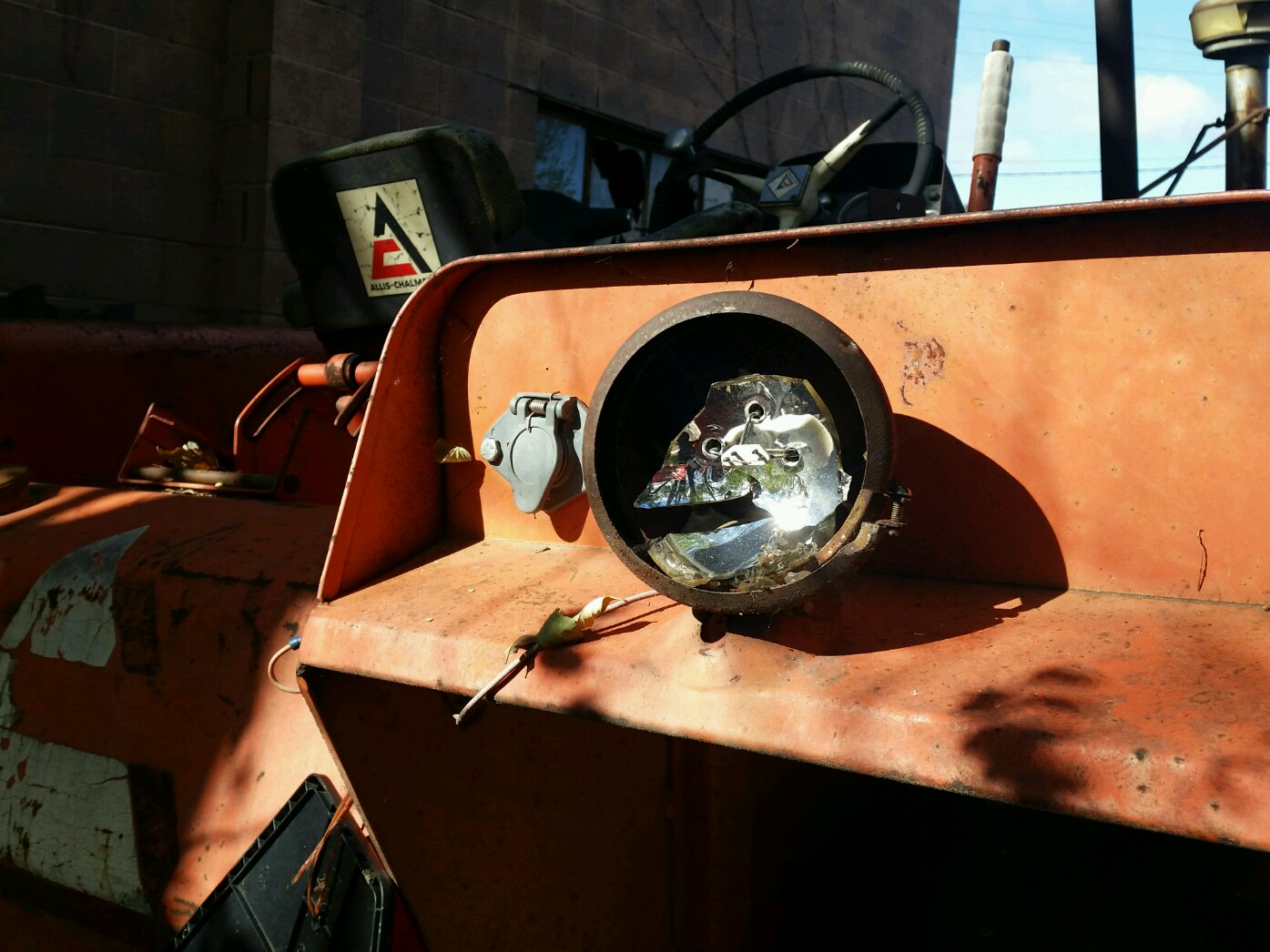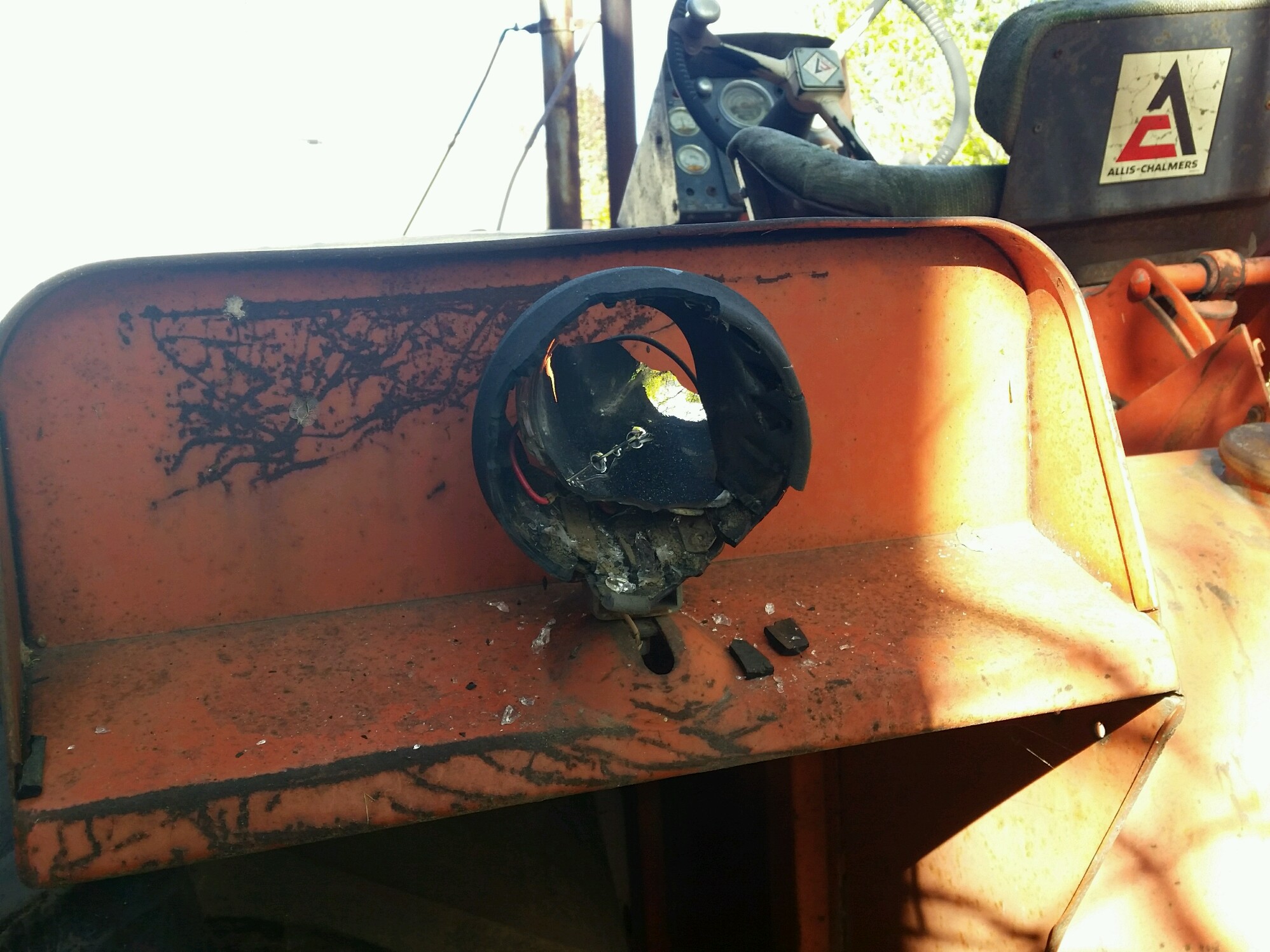 I'm hoping some of you might be able to help me like you've been able to in the past. Yesterday morning my place of work was hit by vandals. They damaged 15 different pieces of equipment that were here. Worst thing was they completely destroyed the cab glass and all the lights on eight cab tractors. I had brought my D21 in to do some work to it and the vandals got it as well. They busted out all four headlghts and the two rear worklights. Fortunately they didn't take out the tachometer or the chrome grill. The tractor once had a cab on it so the lights were moved to the front to the left and right of the radiator. I think they're from Guide Lamp, but I'll do some more investigation. Maybe some of you have some original lights you'd be willing to part with. I have included pictures. Thank you for your time.