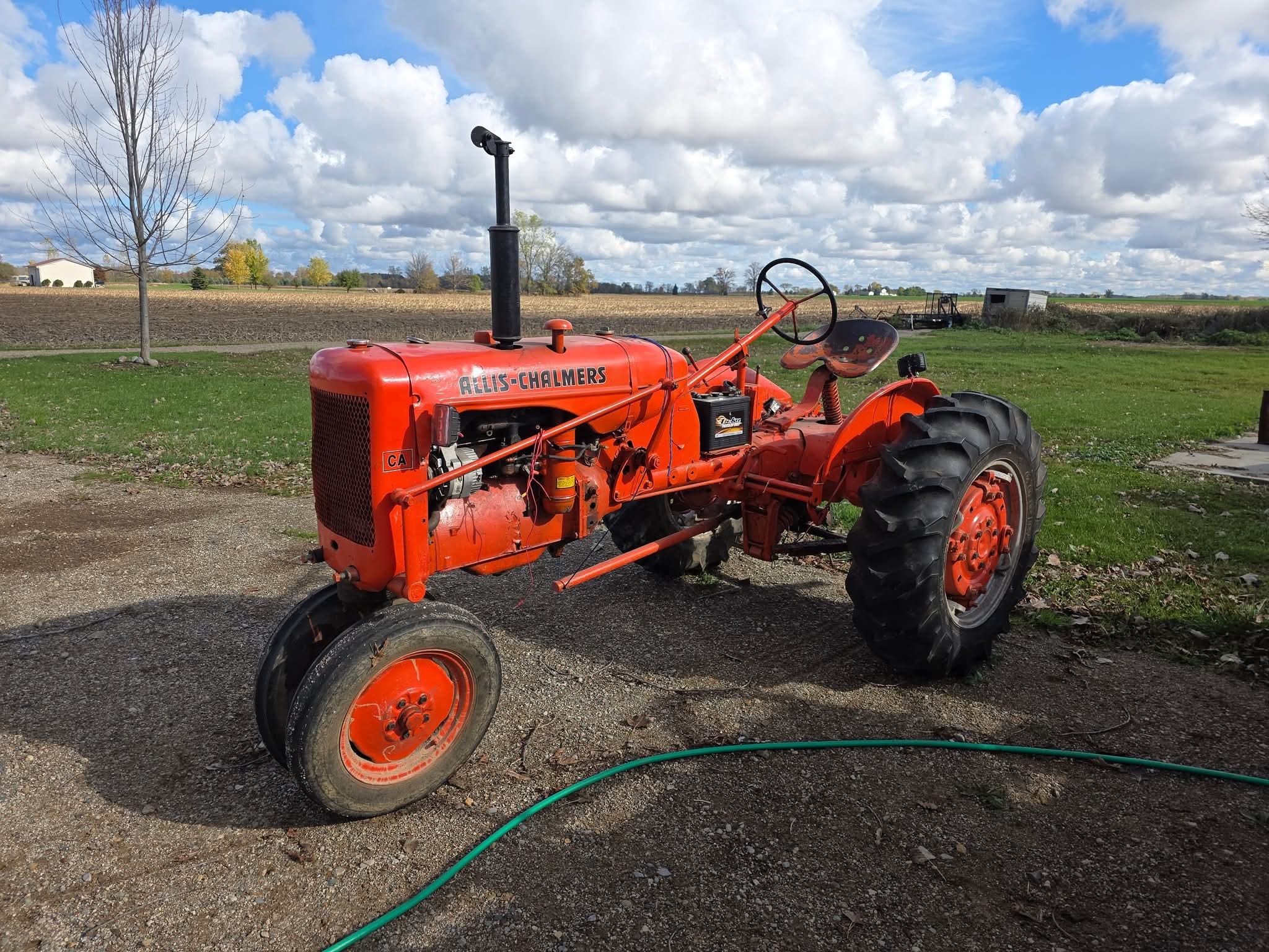 She was pretty bummed when I sold the WD I was planning to restore for her. Ultimately it just needed too much to be worth the effort. So after looking around all summer a I got talking with a buddy of mine who is a local Allis guy, and he said come over I got something to show you. A few weeks later it was in my garage. Seems like a good runner, needs the carb/governor linkage addressed. Needs a brake job big time and the hand clutch either adjusted or rebuilt, and the paint is really slopped on over dirt and old paint, I don't think whoever painted it even used primer. So I suppose Ill sand blast it straighten the tin and give it a good coat of PO1. Should be a fun little project.