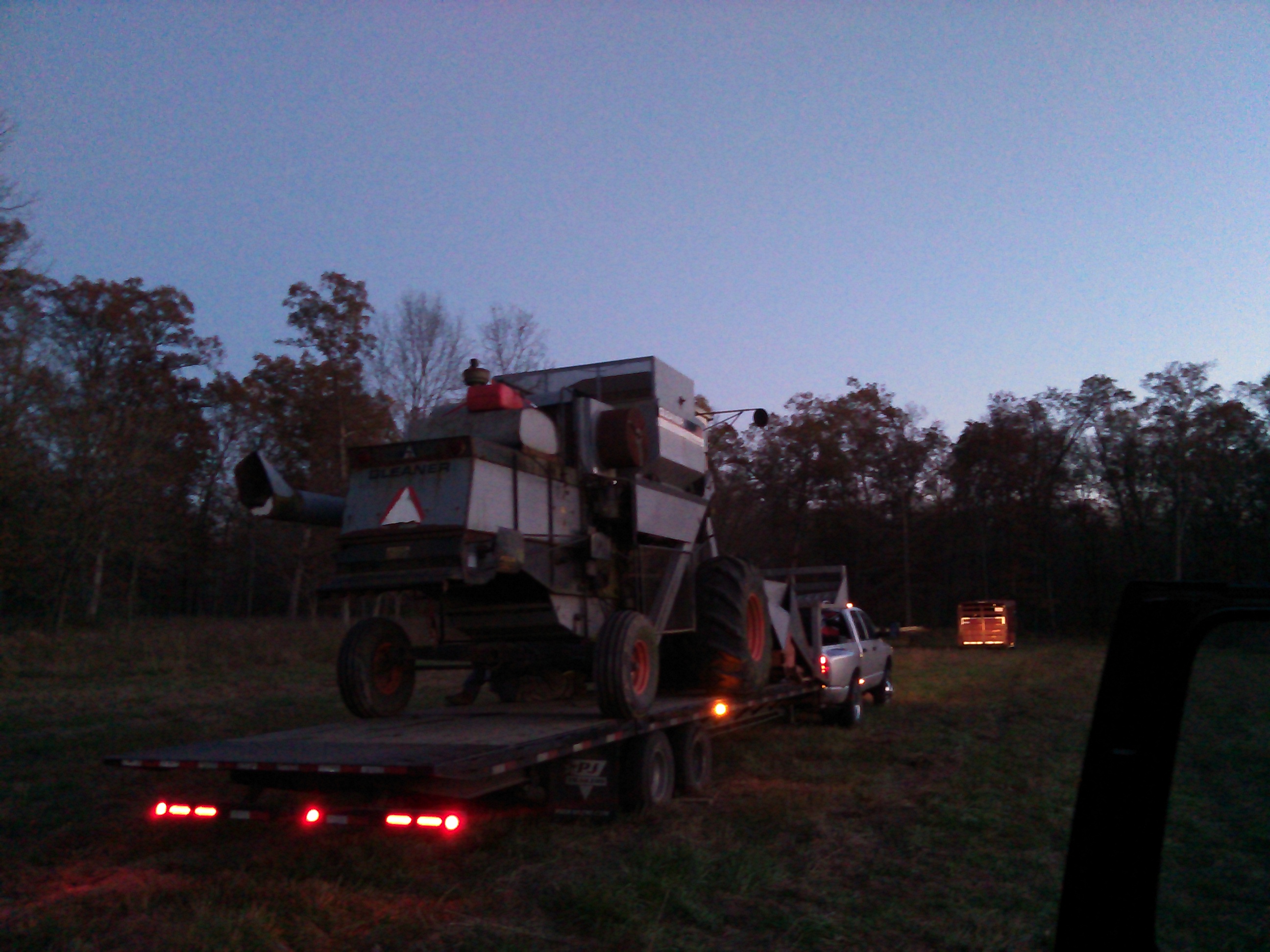 Man, What a journey.  30 ft gooseneck with a hydraulic Dovetail. Was about 14' 6" tall.  Got it loaded just before Dark. Was nervous around some powerlines. and I had the Pleasure of Backing it off the trailer in the Dark, while my hired trucker stood on the back ladder pumping the boat tank primer to keep it running! the powerfold auger makes it impossible to see the rear tire from the seat, and Oh yeah, NO Brakes.