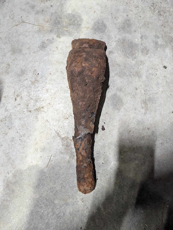 I found this metal detecting one of my pastures. The top of it was maybe 6" below ground. I may have bent it up slightly getting it out of the ground. I have no idea what it is. It looks like something was attached to it through what are probably 3 rivet holes on the wider end. On the other narrower end, I originally thought a wood handle could have gone there (like a broom or hoe handle) but the end of the metal curves back around which would not allow a handle to be installed without cutting a slot into the pole/handle. Any ideas? ![]() ![]() ![]() |