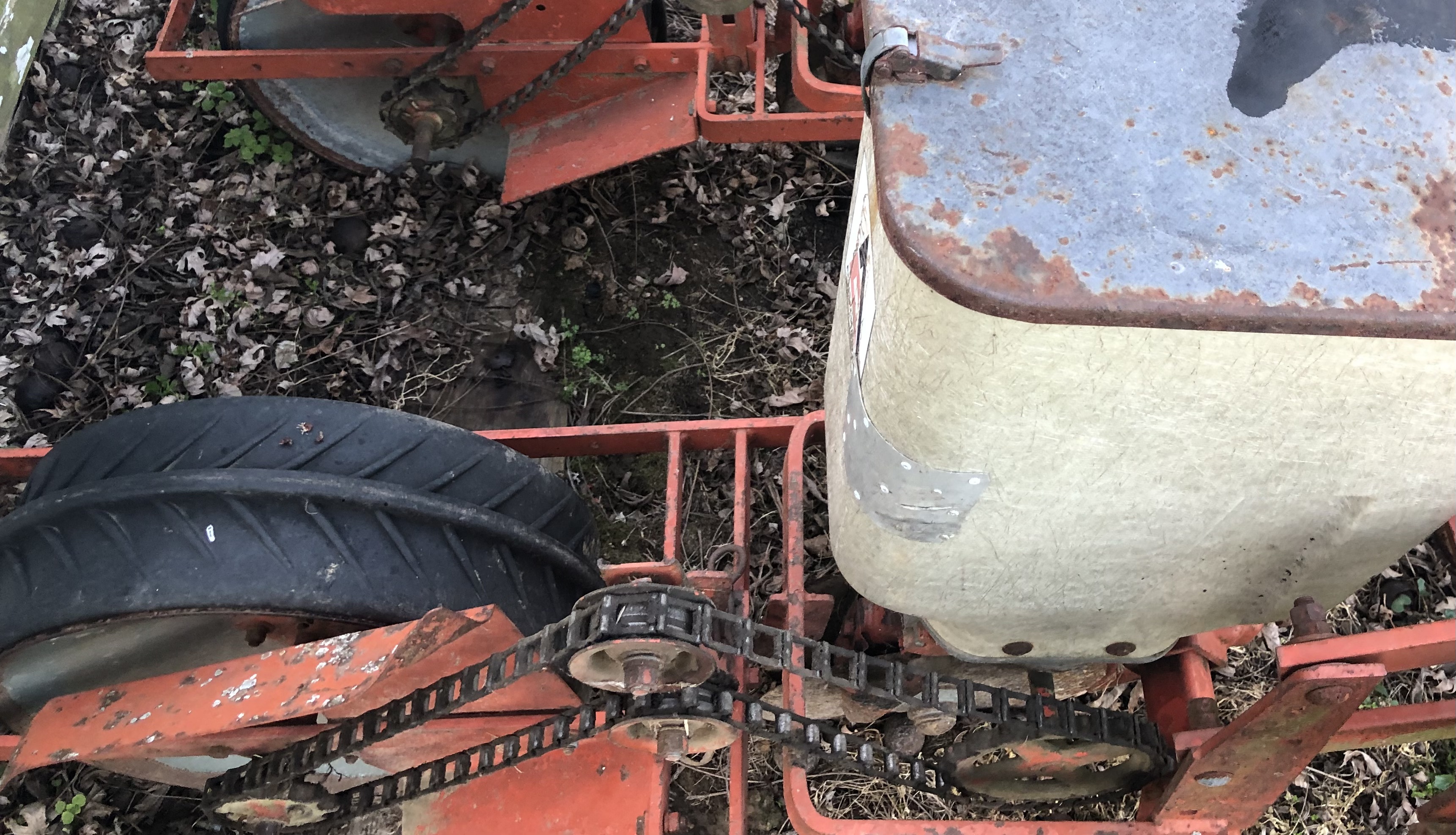 OP Mans still available - that is a 72 series unit - flat chain - could be on different frams - most popular was the 600 3 bar frame. The unit was ordered with the single rib traction tread tire. The most important 'fix' is to add the Sunflower soil control strips - make your own or ben the scrapers to fit at a 90 degree to the opener - other wise in wet soil the 45 degree scraper will throw the soil out of the seed trench. All I remember is a 10 tooth and 14 tooth came std. That yielded an 8" spacing with a 16 cell corn plate. Look at the drive axle under the unit - it is held to the correct backlash via roll pin and shim washers. Most roll pins were worn through and the gear did not mesh properly and 'stripped' Also the tongue and roller (which wobbles and is not worn out as most think) is adjustable via set screw in hopper bottom to allow the tongue to ride on the seed plate for corn and raised up for larger cell bean plates.