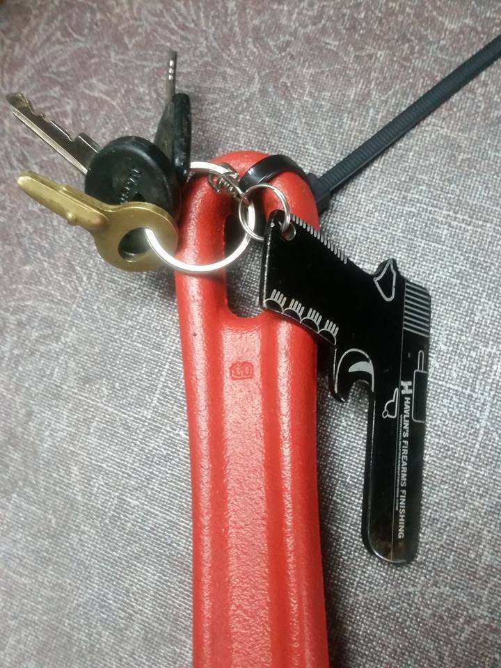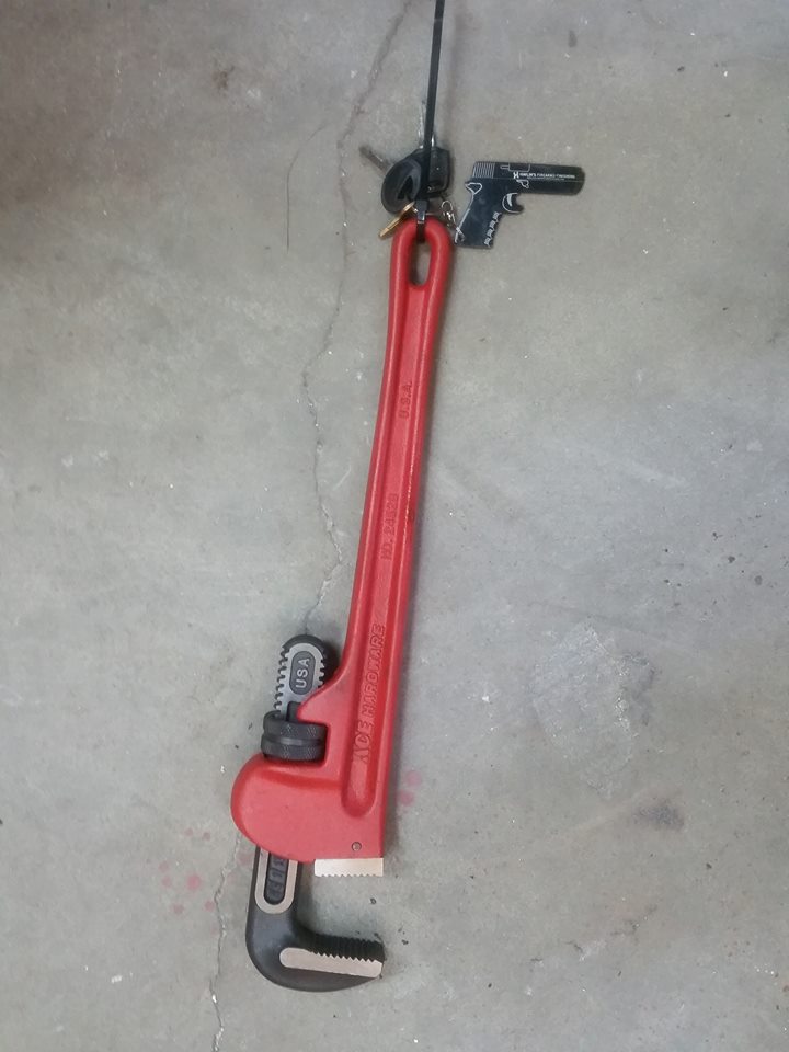 Just take your key out and tie it to the pipe wrench. (Assuming you have a key, that is... )