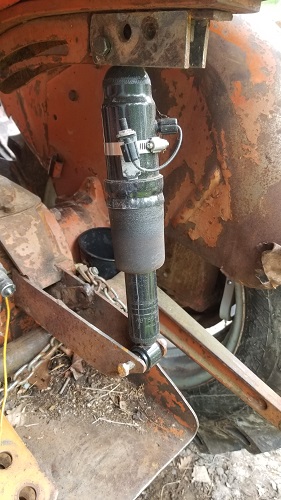 The biggest issue with those well-designed suspensions, is the fact that the coil spring loses its strength over years of use and maybe we are a heavier people than we were in 1957 when it was first introduced. I've been adding a one inch long thin pipe spacer to the top of the spring to make up for that and it raises up the seat pan a bunch. Starting out higher gives you more suspension travel so you won't hit the bottom !!! An air shock I have thought of but air temps would affect how it could work and do you have an on-board air compressor ?? It should work better because I imagine all your old stuff was worn out anyway.