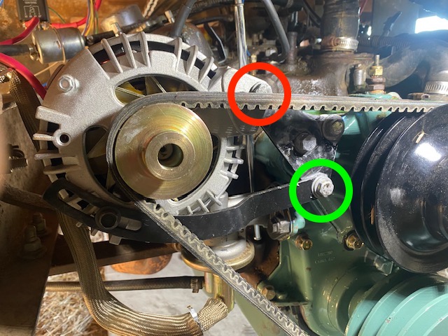 Bolt circled in red ends in a blind pocket in the engine block. It is the main support for the alternator. When tightening belts, tendency may be to loosen the problem child bolt too, but if you do, that would break the seal on the thread sealant......maybe now a leak. One just has to remember to never, ever touch that bolt. The bolt in red and tightning screw on the alternator......and nothing else.