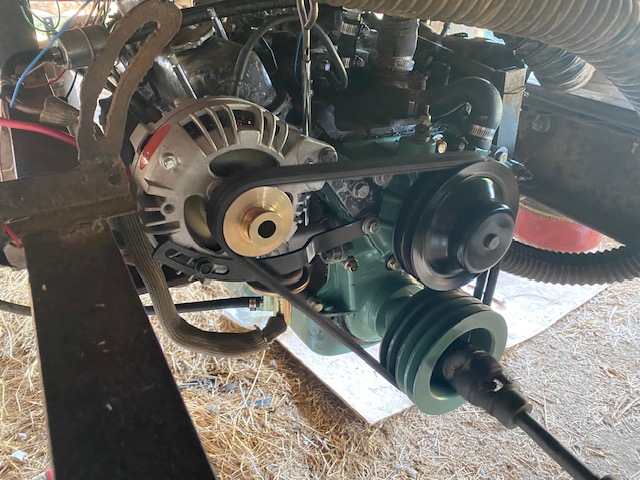 I'll have to measure, but my guess is OD of big pulley is no more than 5 inches.....turning a pulley of about 2 3/4"......so ratio is not much more than 2:1. At engine RPM of 1,000 fast idle speed, even this high amp alternator is not putting out much juice. Even in use in the field, engine rarely exceeds 2,000 RPM's. Documentation that came with alternator shows it tested to 65 amps at idle speed, but that was with 3:1 ratio. At my idle speed, may not be doing much at all.