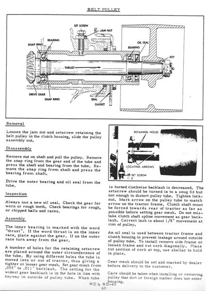 On my 1953 WD, I've not had a belt pulley in it for years.  I recently acquired one, but when I put it in and fired it up, it leaked oil out the side through the opening in the frame rail.  Is there some sort of seal that goes on the belt pulley to keep it from leaking?  Is it the same setup on a WC?  How does that seal get installed?
