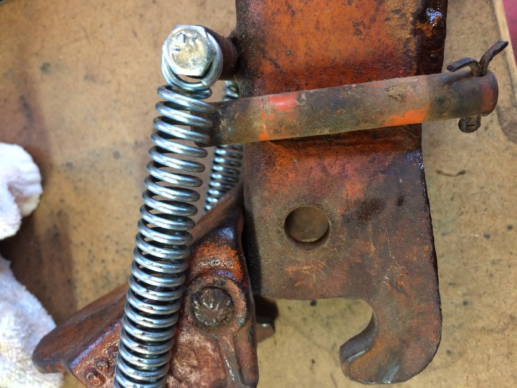 I'm mounting the snap coupler latches on the lift arms on my WD45. The latches are drilled for a ~ 3/8" pin; one latch still has the pin, which I've removed in the photo below. It's lying on top of the latch. (Sorry about the size of the photo - must be a new trick I need to learn!)