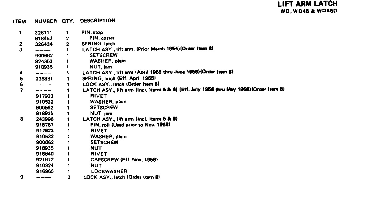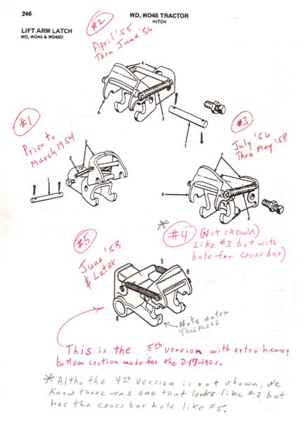 Thanks, Stu (and Brian G). My WD45 is a 1955 per the serial #. Looking at the picture you posted, my lift arms would match up with #5 -  that loop (sized for a large pin) drops below the latch body enough to line up with the holes in the ends of the lift arms on my tractor. The loop diameter looks like it'd match the diameter of the lift arm holes as well. So I suspect that my tractor has 1958 lift arms. Maybe someday I'll run across a pair of the 1958 latches.