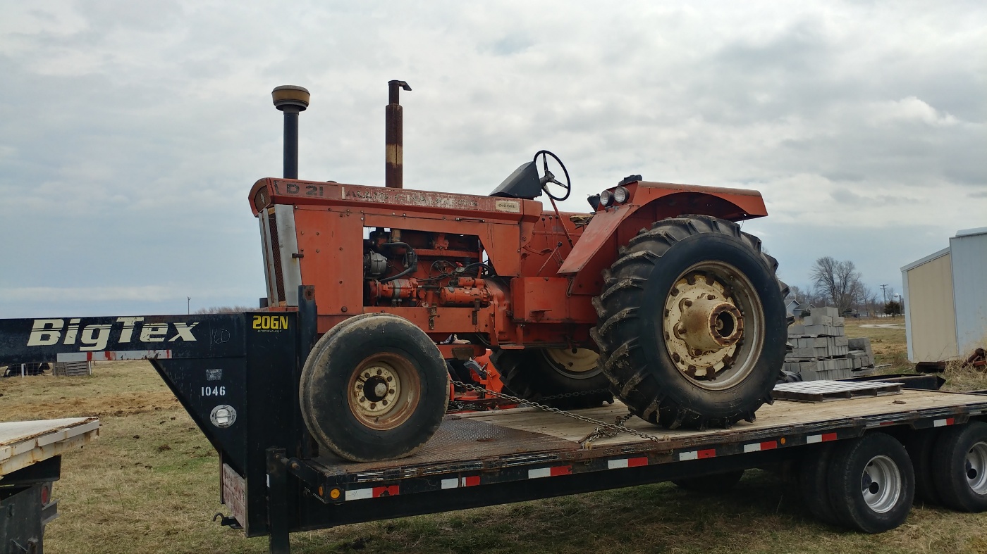 We had a local guy call and consign a straight old D21 today to our next consignment auction on March 24th and March 25th. It has PTO, three point, and duals, but it is stuck in gear. The owners father used to own Galloway Equipment which was the Allis Chalmers dealer in Old Monroe, MO years ago. We had a nice visit talking about old times and the other dealers that were around here back then.