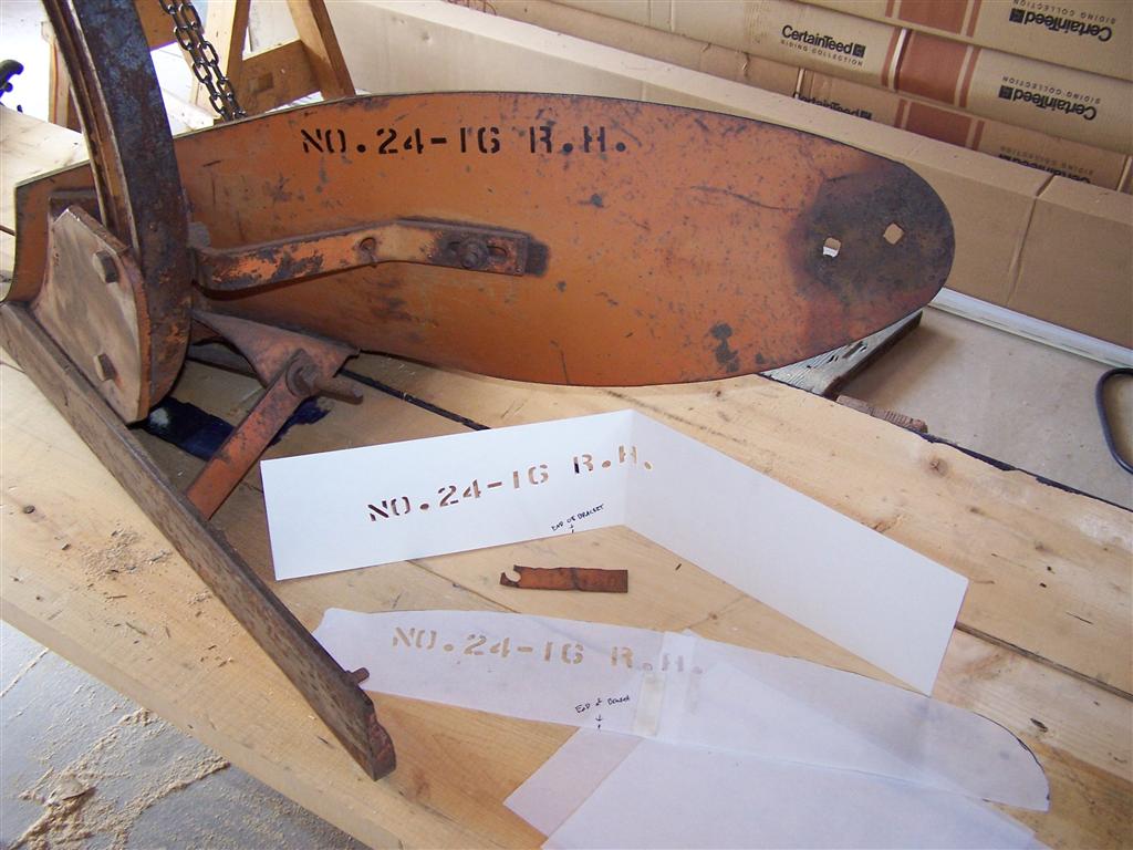 I have never found the correct size number stamps to do so though. I can get the tag number if that means anything to anyone. Here is a pic of my torn tag: It was still attached to the the plow by the hog ring still visible on the plow in this photo (on bracket directly under the period on plow stencil. I was making a stencil from the original factory lettering in photo). I removed the tag while restoring the plow.