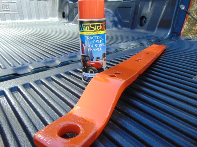 I ordered some paint for touch ups. I ordered it through All States AG Parts. Got the six cans for $29.90 + shipping. I received my order, Van Sickle Super Premium Gloss AC Persian Orange #1 477 70. Never used this product before and used it to touch up the drawbar on the WC. Gave the bar a quick sanding, wiped it down, and applied the paint. Went on good. Easy to apply and covered well. No runs or surprises. Goes on a little dark but seems to lighten up a bit as it cured. So I'm happy with it. ![]() |