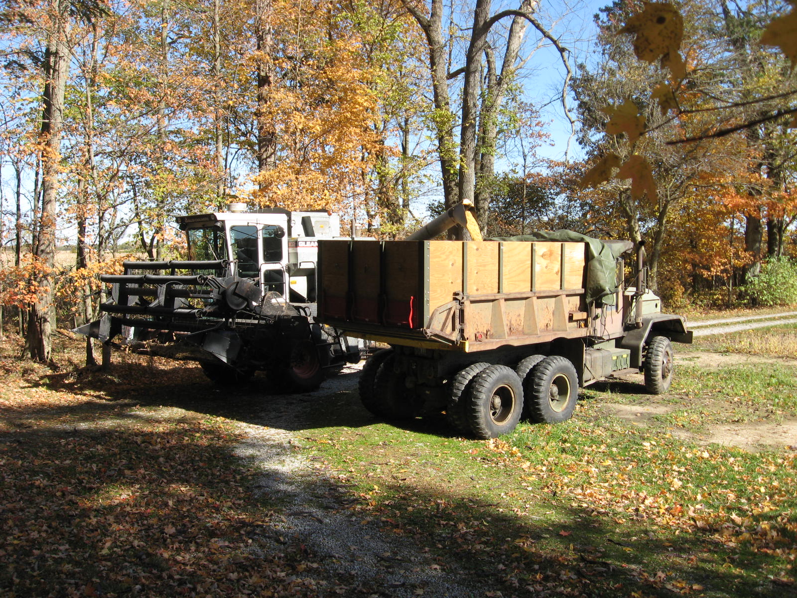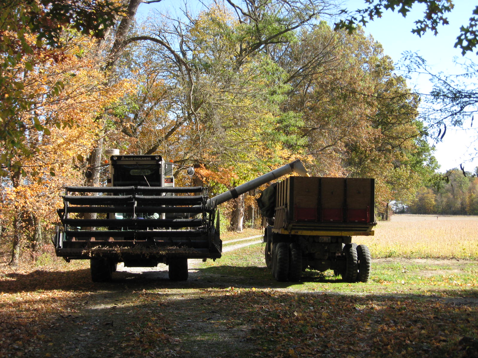1978 Gleaner K2 unloading soybeans into 1972 M817 dump truck.