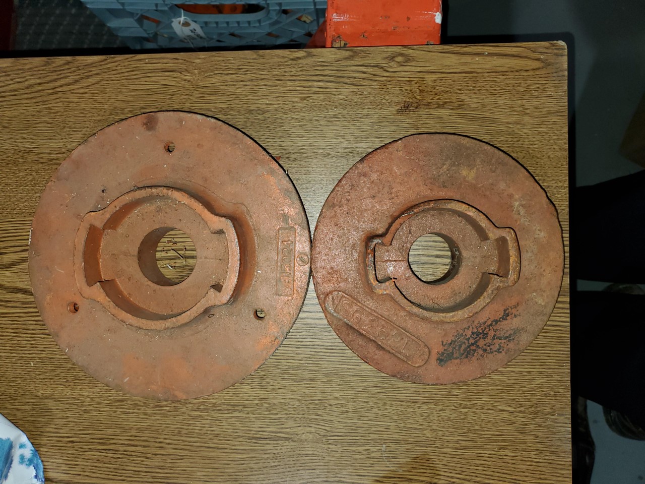 Tom, from what I see in my plow book and on my plow, part # SG252L is the inner clutch on a #1 plow. The center hole should be 1 1/2" diameter for the axle to go through. The # N-297A is the hub cap for the same plow. # LTP-180 is a clutch throw out arm on a # 1 plow. You said you have another piece that is larger and if the number is SG 257L then it is the inner clutch for a #2 plow. The hole in the larger piece would have to be a larger diameter for the larger axle. I am looking for part # 300729 which is the outer clutch for a #2 plow. It would have 2 ears stick out 180 degrees from one another.