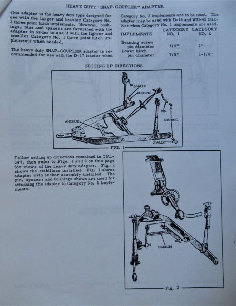 Here are pictures of a couple of factory A-C 3PH adaptors and the stabilizer used with them. Fig. 1 and Fig. are Cat. 2 used on the WD, WD-45 and D-17 tractors and Fig 4. is a Cat. 1 as used on the D-10- D-14 tractors. The first picture (Fig. 1) is the adaptor made specifically for use with plows, harrows, etc. Notice that the top link on it connects to the adaptor rather than the tractor. A stabilizer is not used for when working with these implements.