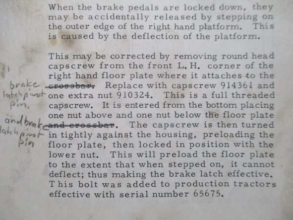 The story goes that in mid-1967 A-C built about 100 new One-Eighty gas tractors with the G-226 engine running at 2,200 RPM high idle. Problems arose when customers started complaining about excessive engine vibrations. As per Norm Swinford's book ( page 109) the platform vibration would put the operators feet to sleep. The original test tractor (only one) was retested and it was acceptable in the area of complaint. Some of you are aware that my project tractor for this past fall/winter has been installing a One-Eighty platform/seat frame/brake/clutch pedals on an early One-Seventy gas. Raising the deck up approx 9 inches makes this tractor really nice to drive !! But, I can assure you, this platform conversion project has re-produced the same annoying platform vibrations that were experienced in 1967. It took a little engineering and thinking of how to deal with this problem, but in the end, I didn't have to switch to a different engine !! The solution was really quite simple: #1. make rubber stops for the clutch and brake pedals, so they didn't sit there and vibrate against the platforms at high idle, and #2. place rubber edging strips on top of the battery box so the left platform wasn't resting on bare steel, again causing engine vibrations to be amplified to an annoying level. This tractor is now smooooth and a real joy to operate, even at 2,200 RPM's. Why did the original tractor not bother ?? I've seen that particular tractor back when the Deutz buy-out happened. I remember the fenders not being "production" pieces. The press-brake bends were tighter and clearly a proto-type build. I can only assume the platform pieces and battery box were the same way, not exactly production pieces and maybe even a gauge heavier material. So, 55 years later, I think I've figured out what went wrong for A-C on this model. The engine wasn't really that bad, it's just the way they built the platform made a little problem into a BIG problem. So, anyone who wants to build a "high-deck" One-Seventy, be prepared for what you may have to deal with.
