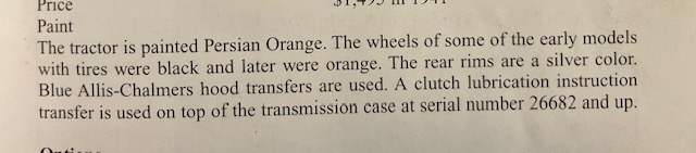 There is no factual information and some disagreement but the consensus among knowledgeable people 20 years ago was most early tractors had black wheels and rims. Later ones had orange wheels and silver rims. The split was about 194⁰. Period pictures show these colors and combinations plus others but who knows if factory or not? The operators manual shows all black except the rear rims that appear to be white.