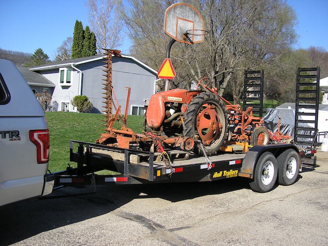 This is what the trip to Illinois was all about. This tractor has sat since the 90's. I bought it for some of the implements that came with it. I did get the tractor running and it runs well but I have no oil pressure showing on the gauge. I doubt the gauge does work. I have read some previous posts about G's losing prime etc. Is the relief valve plug right below where the gauge mounts? On a side note I will have a 2 sets of cultivators (1 of each style) for sale in the near future. Also a #4 sickle mower.