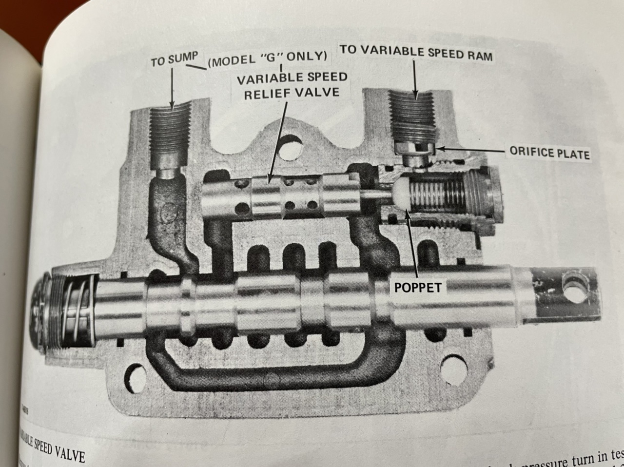 Here is a cut away picture of the valve in question…oil is supplied and returned through the same port on the valve…the port labeled “TO VARIABLE SPEED RAM”…how is the return oil supposed to get past the poppet?