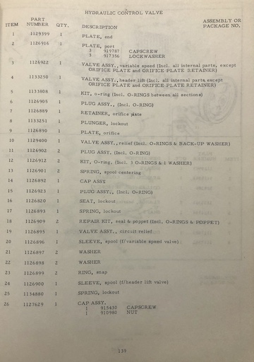 Header goes up and down fine…I’ve had item 10 relief valve out that all looked clean, new hoses on the pump feed and return sump, oil tank has been drained and cleaned and new filter in the system.