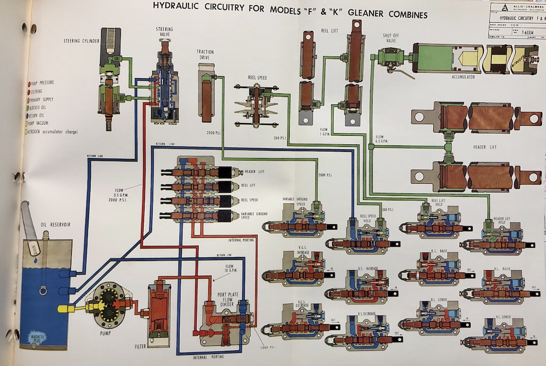 So you have an AC Gleaner Service Manual? I do too. Maybe you haven't found it's hydraulic circuitry fold-out near the back of the manual? If not, here is a copy of my gleaner K/F hydraulic circuitry that shows the functionality of each component. It shows by colors how the Variable Speed Valve's internals function. In that same service manual's hydraulic section, try going to page 7 where it discusses in detail how the variable speed valve(VSV) operates.