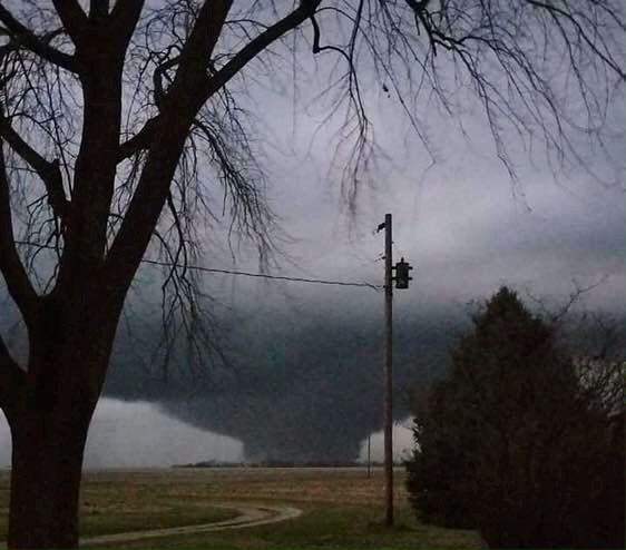 In this photo that someone captured just south of Taylorville, I believe two storm cells, each with tornados, convened into one big twister.