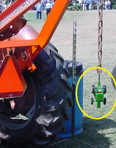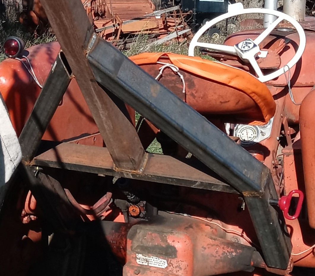![]() ![]() For you purists, this is definitely not original. This is my farm crane I built a couple years ago on my D17. Mostly built for getting large pumpkins out of the field. Extended fully it is all of 8' above the ground. Haven't used it for anything else, but, was able to lift my #2 3-16 plow with boom retracted. Going from memory, the tubes that slide over the lift arms are 2"x3" 1/4" wall. The telescoping boom is 2"x2"x1/4" inside of 2 1/2" x 2 1/2" x 1/4". On the end of the boom is a plate with keyhole slots so I can adjust the length of the chain. The chain has regular chain hook on one end, and choker hook on other end. The holes that pin it to the lift arms are towards the bottom of the tubes to increase lift angle. |
