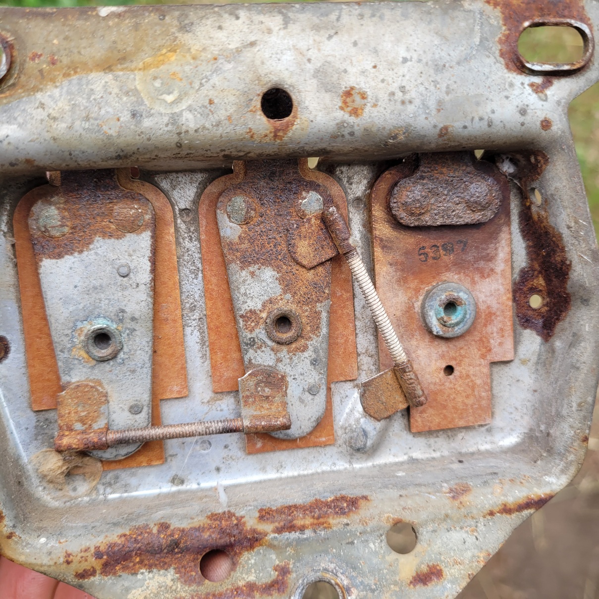The one terminal that is rusted off went to the down and I would assume strapped to the part with the flathead. That is the only one as seem on the bottom that is isolated like that.