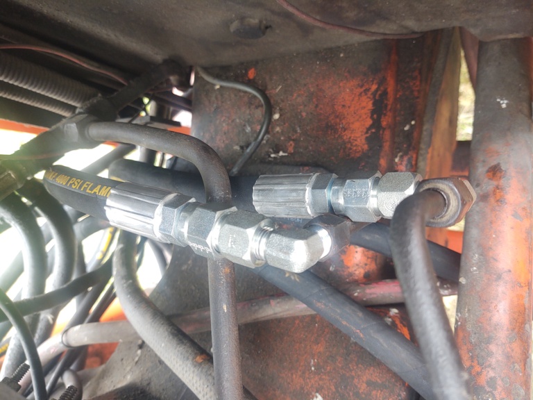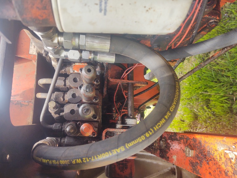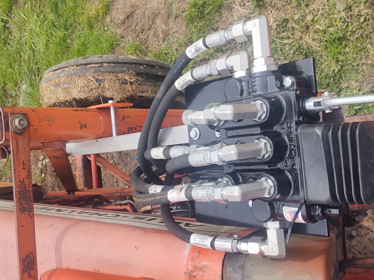 I finally finished this install. First few pictures were the tricky part that I wasn't sure about originally. I ended up getting a 3/4 T (SAE 12) and connected it to the filter. I ended up getting a 2 ft SAE 12 Hose and you can see I had to loop it. I couldn't find a 1 ft hose in stock and I think that would have been best. I ended up putting an adapter moving the 12 to a 10 size and ran a 10 hose to the output port on the joystick. The joystick had all 12 SAE ports. Due to parts availability I had to get reducers rather than buy an elbow that went from 12 to 10. I am going to try and make a video of all of the issues to watch out for. The only problem I have encountered is that the up movement of the boom is slower than when I was using the remotes. Not sure why? Should I be using a smaller diameter hose going into the controller? Princeton manual didn't mention anyway to change the speed. Slow isn't the end of the world. It may be safer in some ways. I have not run the hoses for the bale grabber yet. I wanted to install it and make sure I know how long the hoses need to be before I buy. For those that want to tackle this and wondering on cost, I have $485 into the controller, I have about another $600 in fittings and hoses. Not to mention the Skidsteer Universal adapter, skidsteer bucket, skidsteer bale spear, skidsteer bale grabber and skidsteer hay grapple. About double what I have invested in the tractor! All parts were bought from Surplus Center. I will say it is really convenient and fast to switch from one implement to the other. I bought a smaller 5 ft bucket because I feel that the 500 loader matches a 5ft bucket. That's what I took off of it. Enjoy the pics and now I have to get my Allis Plow ready! This picture shows where I split the hydraulic line coming out of the pump. I used SAE 6 Elbow, then converted to SAE 8 for the hose. At the controller, I went from the pump to the IN port. The other line is going to the Power Beyond port. ![]() Here is the OUT port hose from the controller on the end of the T, the other T port going down goes back to the hydraulic stack. I show two shots of this area under the platform. ![]() ![]() This shows the mount and fittings. I got short and extra long elbows so that the lines will fit on top of each other and around each other. The plate is 12 inches by 12 inches. I almost made it too close to the tractor but got lucky. ![]() Here is side view. I think I have enough droop on the lines to install the side panels, but will find out soon. ![]() Here is the bucket pic and hay grapple pic. ![]() ![]() |