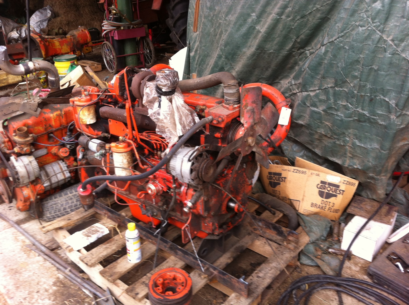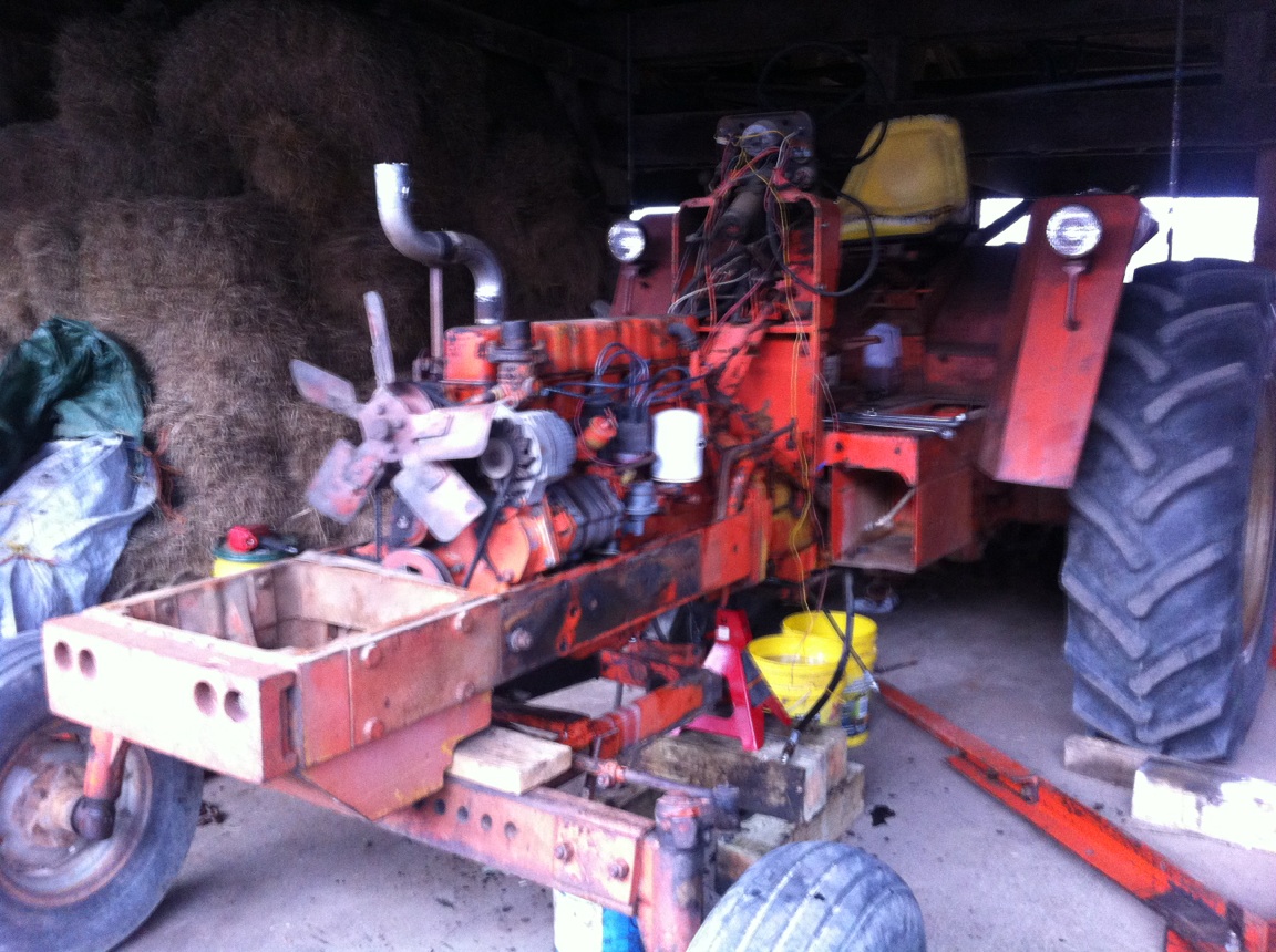 so after all the rain lately, i got a few hours to work on the 190, i do have a good flywheel coming from rick, since some measurements where a little funky on my. will be ordering all the parts from sandy lake when the milk check comes next week. well anyways, i took the combine fan off and put the 190 gas fan on. it sits 3/4" further forward from the valve cover than on the gas engine and about an inch and a quarter or so further up. this should not be a problem, just a little fitting of the fan shroud. also got the front pulley off so i can take it too the machine shop to be shortened. the rubber is a little dried up, does anyone know if i can get it rebuilt with new rubber? then on to the oil fill, since i have the inline pump on this engine, i have a block off plate where the fuel pump would go on the side of the block. i will use this plate and fabricate an oil fill so i dont have to cut a hole in the hood or take it off every time i wanna put oil in it since the fill is currently in the valve cover. i took the turbine outlet off the turbo, cleaned it up, put a new gasket in and reinstalled it but with the outlet pointing up. still have to take the manifold off and install new gaskets. as far as the starter and rear plate, i will have to reuse the rear plate from the tractor as the one from the combine is slightly different. i think this will also cause me to have to use the gas engine starter. the alternator is the same on both engines, just one has a single groove pulley and the other a double. then comes the radiator. the bottom outlet of the radiator is on the wrong side for this engine. my radiator is in good shape, well the core is anyways, the ends need some work. i am thinking i can take it to a radiator shop and have then fix it up and sides of the outlet and the drain petcock. it may cost a little more but will be a lot easier and cleaner. i started my hunt for a intercooler from a 7020 or possibly 1 from a 426. now my other thoughts or dreams rather, lol, how do i got about converting from 540 pto to the 540/1000 pto setup? would really like to have 1000 pto for running the generator when i have to. might even be picking up a 1000 pto discbine. also picked up a set, well 3, 9 bolt 34"duals at an auction the other day. have a set of hubs in the works. then got a decent set of firestone SAT 23* for 50 bucks to put on the duals. one needs a boot, no big deal. ok ill shut up now, here a crappy picture of what i got done today