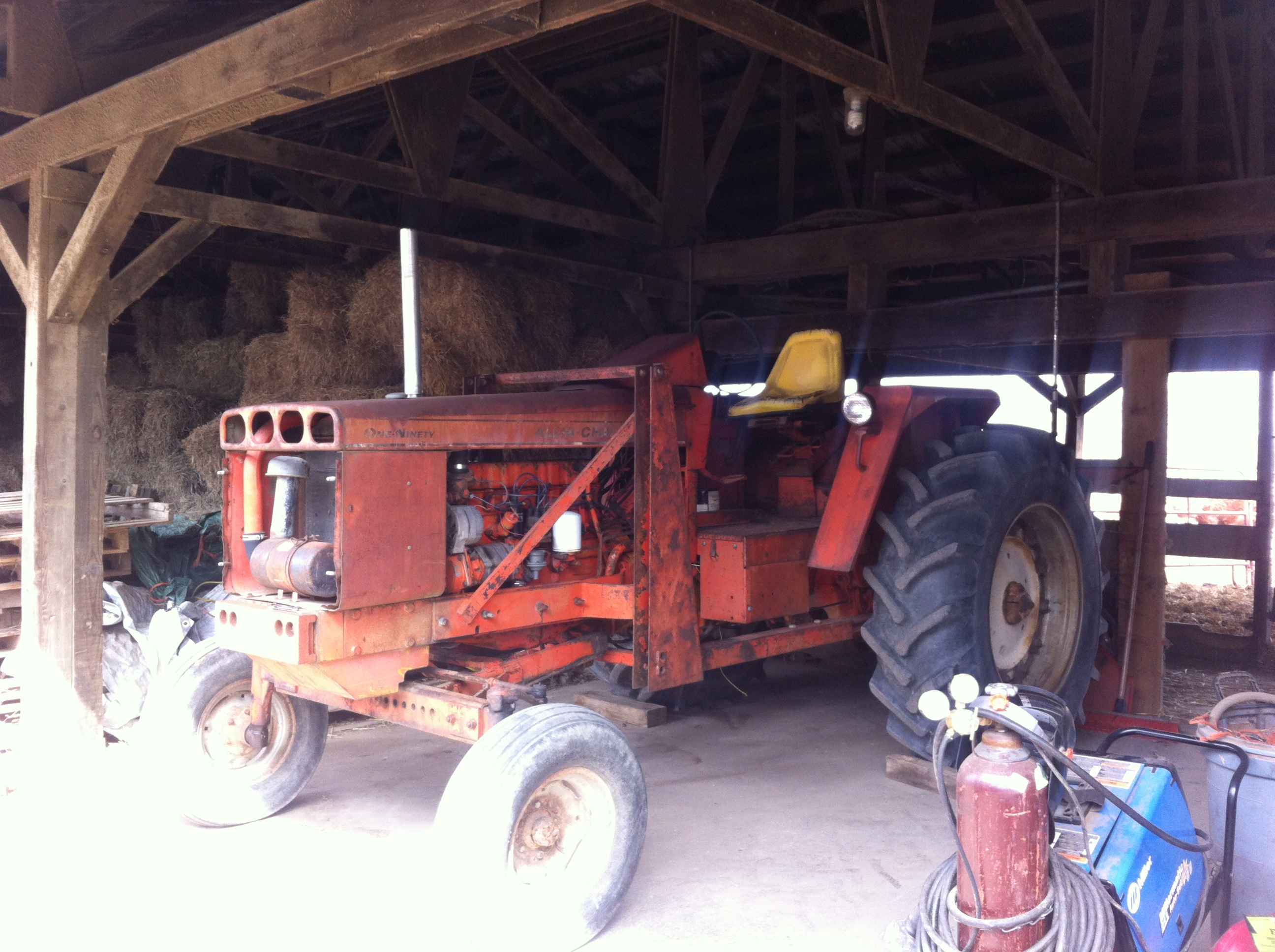 it does have the small axles. i dont know how to tell if they have been hardened, but i doubt that they are. i wish it had the upgraded axles, but i got the tractor cheap enough($1200) with near new loaded rear tires, that i will upgrade to the larger axles and better differential when i pull the rear apart to fix 3rd gear. hopefully do that this fall or winter. as far as the pole barn, it been chilly in the mornings but it been as high as 75 the last 2 weeks here. except for this morning, we got 2" of snow and it was about 30 degrees. i work out of the barn pretty much year rough though. few other pictures coming in a few minutes here