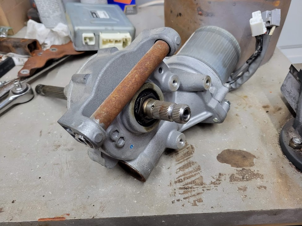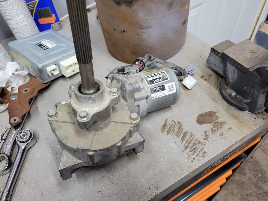 I did have a pre-requisite that i wanted it to look as factory "in place" as it could as well as be between the frame rails and not externally mounted. I was originally thinking of a ford power steering pump and gear but after extensive searching for something to work, I was stuck with a right hand drive unit to mount between the frame rails. since i am in canada, right hand drive parts are hard to find and i wanted to stay away from an uncommon source in case something breaks in the future. Here was my solution. ![]() ![]() This was an ELECTRIC power steering pump from a 2007 saturn Vue SUV. these use a one piece steering shaft that fits in line of the original steering gear. it uses torque sensors to provide steering assistance but without the worry of leaking fluid or hiding another reservoir for nobody to see. PLUS.... the unit is very small. It will fit in the spot between the engine and bolster with plenty of room to spare. the bonus part is if the fuse blows or there is a malfunction, the unit will default to an "off" position and the unit will return back to manual steering. these units use 10AWG wire to power them from the battery, they also draw about 60 amps at full lock. it seems like a lot but with the newer technology of 100+ amp alternators we should be just fine running it off these tractors. keep your eyes peeled for installation once the bracket is made up and this setup is painted persian orange!