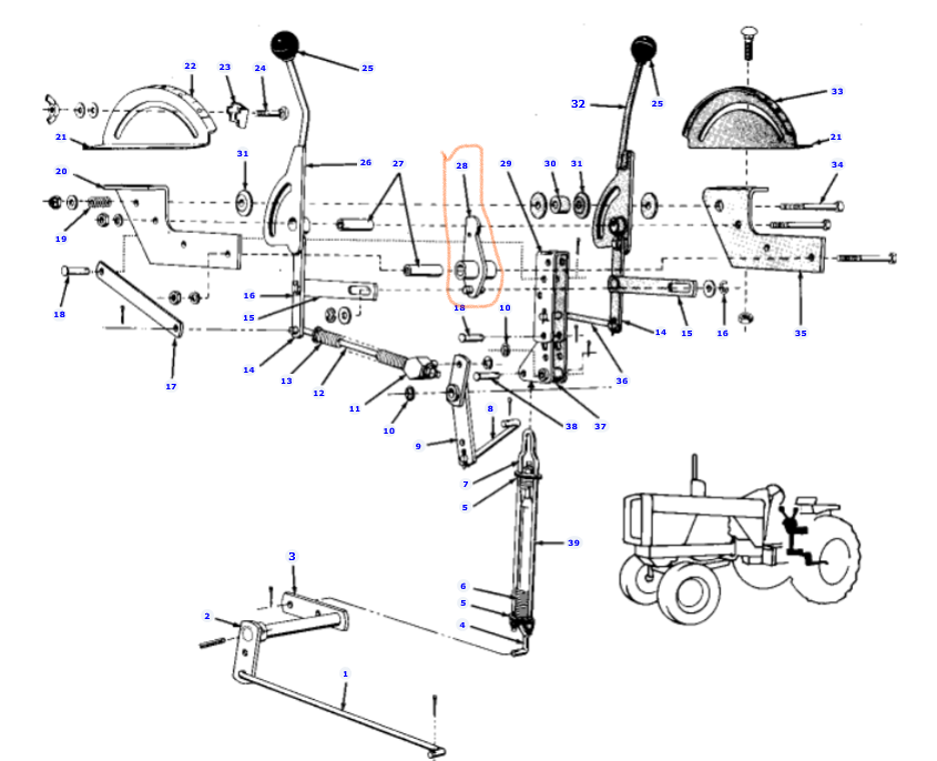 A quick fix for #28 being stuck is this. Loosen the nut one full turn on the bolt that goes thru #28. Turn the head of the same bolt in full revolutions until you can turn it freely. Leave the nut right where you left it. It is so rusty it will never fall off and now the linkage is free to move without going to all the extra work to free up the bushing inside of #28. I can do this procedure in under 3 minutes with the right wrenches.