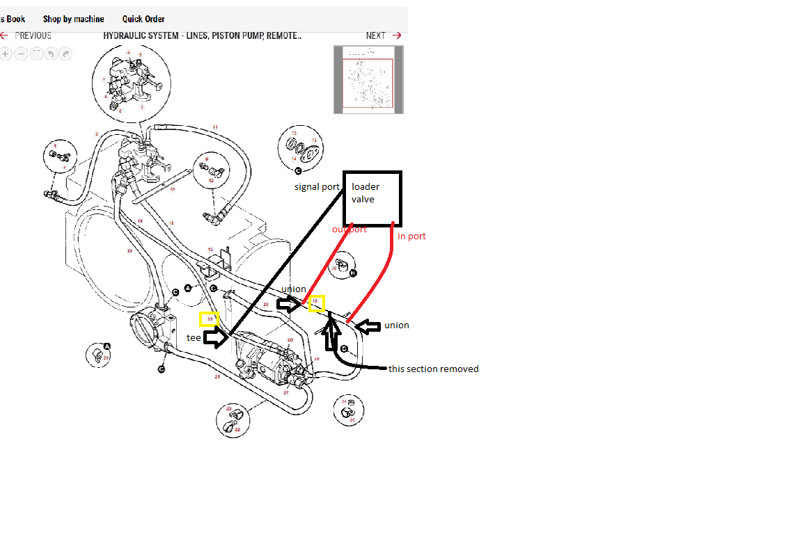 If I am understanding correctly you are saying to run the loader valve in circuit between the pump and valve stack on line 18 (on the diagram below). Using the "IN & OUT" ports on the loader valve. Then tee into line 19 (on diagram below) for "SIGNAL" line? I'm definitely no hydraulic expert (hence the question/clarification), but will this allow for the valve stack to have live power with the loader valve closed? Thanks, |
