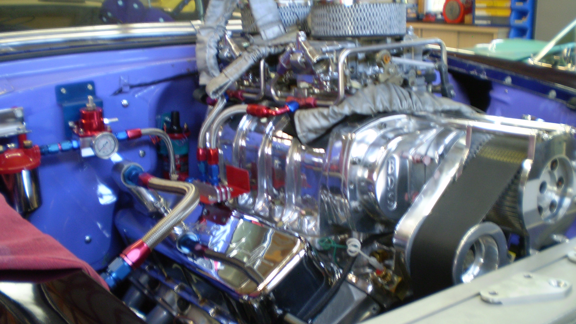 I got this 55 Chebby I'm workin' on in the outside wire shop. Doin' a complete wiring system on it and designed the fuel delivery system for this big funny lookin' engine hanging out of the engine compartment where the hood is supposed to be... LOL! Not mine. Customer's car.