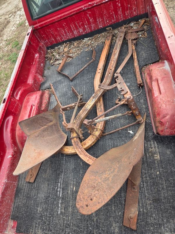 A friend of a friend who's a big JD guy was cleaning out a bunch of scrap around his place. They asked me to drop by since he had a couple of orange painted pieces laying around. I lucked into parts of a B/C two-way plow setup.