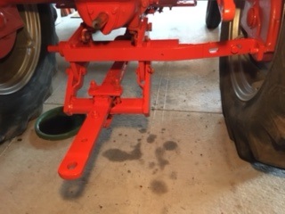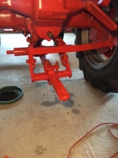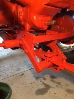I think I put it back together.  Does this look right?  Feels pretty flimsy.  What is the bar going to the right?  It almost touches the back tire (maybe 2" away).  What does the thicker bar with thinner bars coming out on both sides for (sorry for the technical terms)? The second picture, you can see how the pin is at an angle.  The whole unit is kinda lose.  Is it supposed to be like that?   There is also a bell coupling under the tractor.  I have it put back together.  There is a lever that goes through the right floorboard that pulls a chain to pull a pin to release the draw bar.