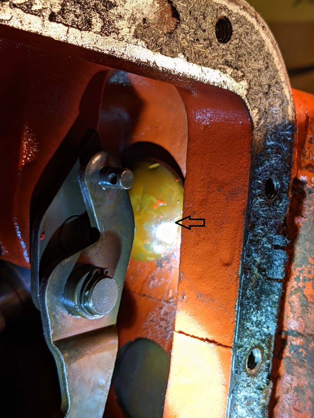 Looking rearward from bottom of torque tube/hydraulic pump cover.  That's the linkage of the hydraulic pump in front of plug.