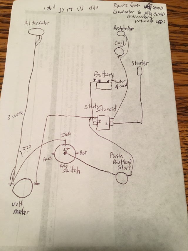 Couple observations The original post is from October. I think we need to bare down and help this guy. Where is Steve? First I have never put on a Petronix system. I am assuming that the extra wire coming out of the distributor to the coil is needed??? Normally there is only a wire in and a wire out of the coil! Second The alternator is a 3 wire unit by the look of the sketch. The plug on the alternator has two wires and they have to be attached / routed properly, and not to the voltmeter as shown. The red wire coming out of the small plug in goes to the terminaton the alternator. The white wire gets a diode (have to check on the size) installed with the band towards the alternator then goes to accessories terminal of key switch, I need to go get my hand sketch that I have used for the WD's. Should be about the same except I don't have solenoid. I am not the expert on these custom but have put together a couple custom systems. Steve at B&B was a big help too! And that is what these are there is no wiring diagram from Allis on this conversion. BTW I do like the tractors that I have converted to 12v neg ground with alternator. I personally wanted a more robust charging system. Also the systems that were on these tractors were junk! They start really well! Regards, Chris |