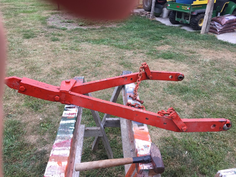 In the afternoon the man I was waiting for stopped by.  He delivered my new, used three point adapter.  It weighed a lot more than I expected and was all seized up but I think it was worth the $150.00 I paid for it.  Went to work oiling and moving the  balls in the ends of the arms and discovered they have holes for both Cat. I and Cat. II  Wasn't expecting that but I'm pleased to have it.  Spent some time with the penetrating oil, handy man jack, and the come along moving the arms in and out to break them free.  I finally got it to the point I could move it by hand, it just needs some use to really work it loose.  I didn't find any name or number cast into it so I'm not even sure what brand it is.