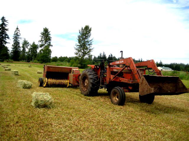 Finally dried out enough to get the hay done last week. After mowing with my John Deere 2040, I thought I'd make the rest of this chore fun, so I raked with my 1928 20-35 and JD 594 rake. Then a buddy came over and we baled with his AC 175. Had a good time.