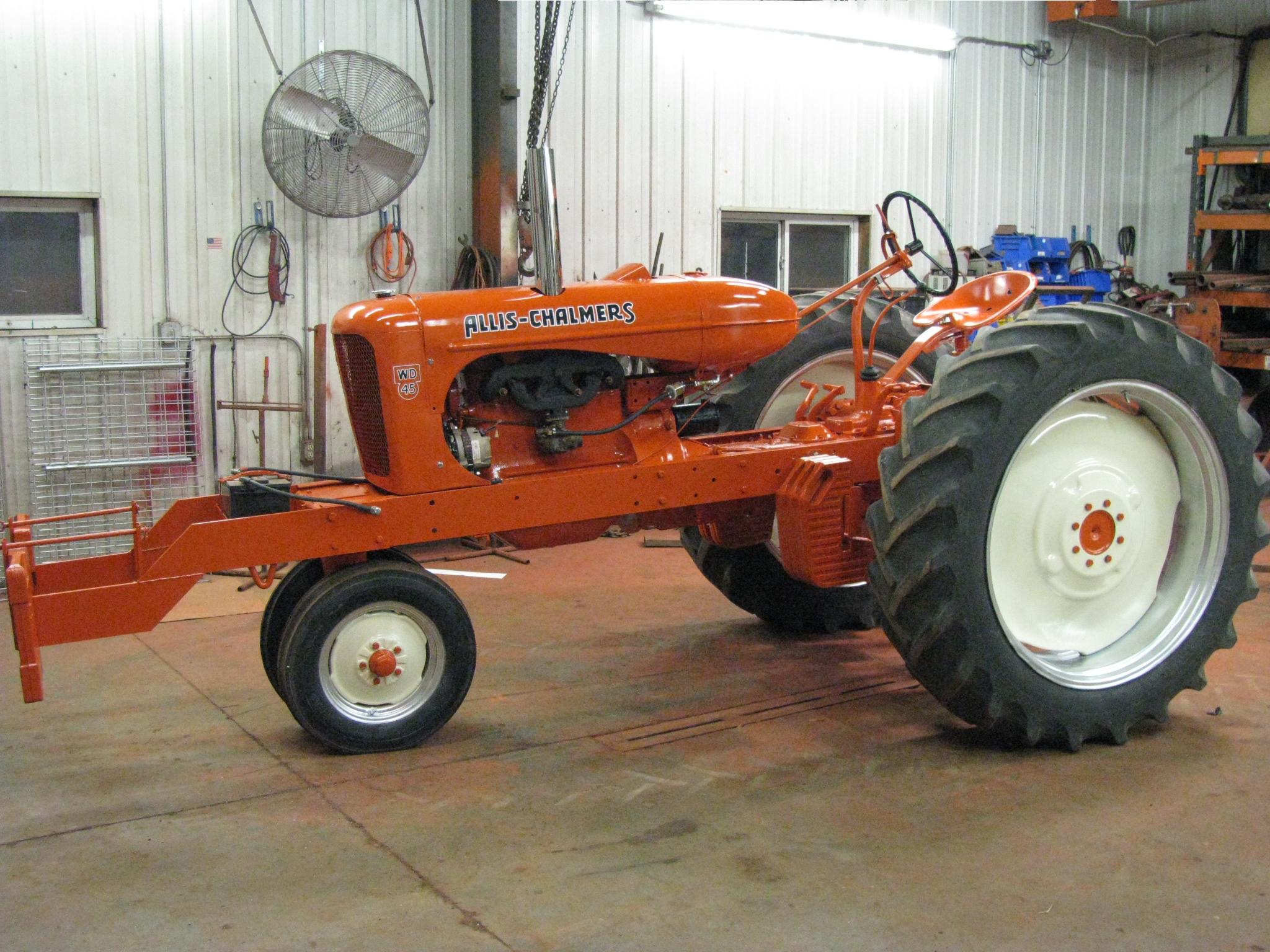 those rear wheels were some light pressed steel 9 bolt wheels that have been on the farm here forever used as duals on a small tractor for seeding. The centers were torn up, and I had bought a real nice set on an auction so I used the junky set for the Allis and moved the centers for a 60" tread spaceing when put on the WD-45 and welded the 8 bolt repair pattern in. They are from a John Deere, but I don't know what. A trip to the sandblaster and the tire shop, some new tubes, switching 2 pairs of tires and a pile of my time.