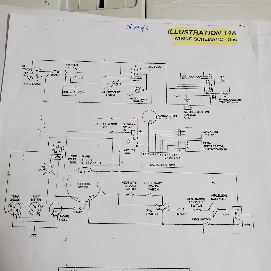 I have battled this for years. Today it has stopped running. I have a Jacobsen 445G turfcat mower. Front deck 72 inch cut. Since I acquired it, at times it would start with the key, others it would not. It would start by jumping at starter fine, but you got to lay on the ground to do it. It has several safety switches, seat, PTO, Parking brake, and tranny lockout. Recently it would die when you put tranny in gear, or turned on PTO. Today it died from the parking brake being released. It has a start circuit and run circuit for the switches and interlocks. I was wondering if one of you electrical gurus would look at the wiring schematic and see what is most likely cause. I put a new key switch on it, and the brake pedal switch today. Still nothing. I think it might be the tranny switch, but not smart enough to be able to tell. It started  after several attempts today after i wiggled the brake switch. After it warmed up, i moved pedal and it died instantly, this was with old limit switch on pedal. Any help appreciated . I have a copy of schematic but can't post it. I can text a copy if you want to help. Thanks a million! Tracy