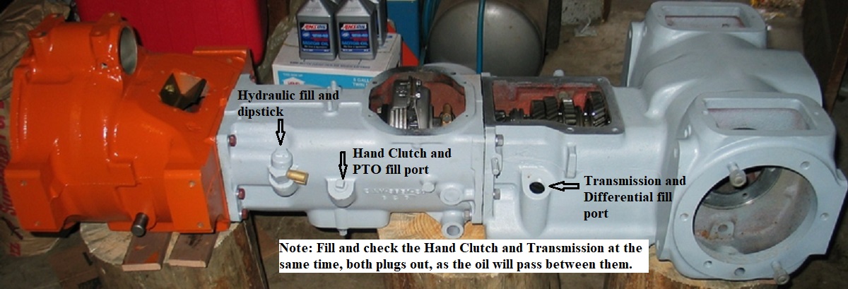 Nice picture, but ohh so incorrect !! The front location is the hydraulic pump dipstick and this is where you actually fill it with oil. Takes about 6 quarts. The middle location is for the PTO gears and hand clutch. Will take about 2 gallons of oil. The rear plug is the transmission/differential and it too will take 2+ gallons or a tick more. You can use the same type transmission/hydraulic oil in all three locations. Fill the two rear plugs at the same time as the oil actually can run between them. Don't fill one and put the plug in. Fill them both at the same time !!!