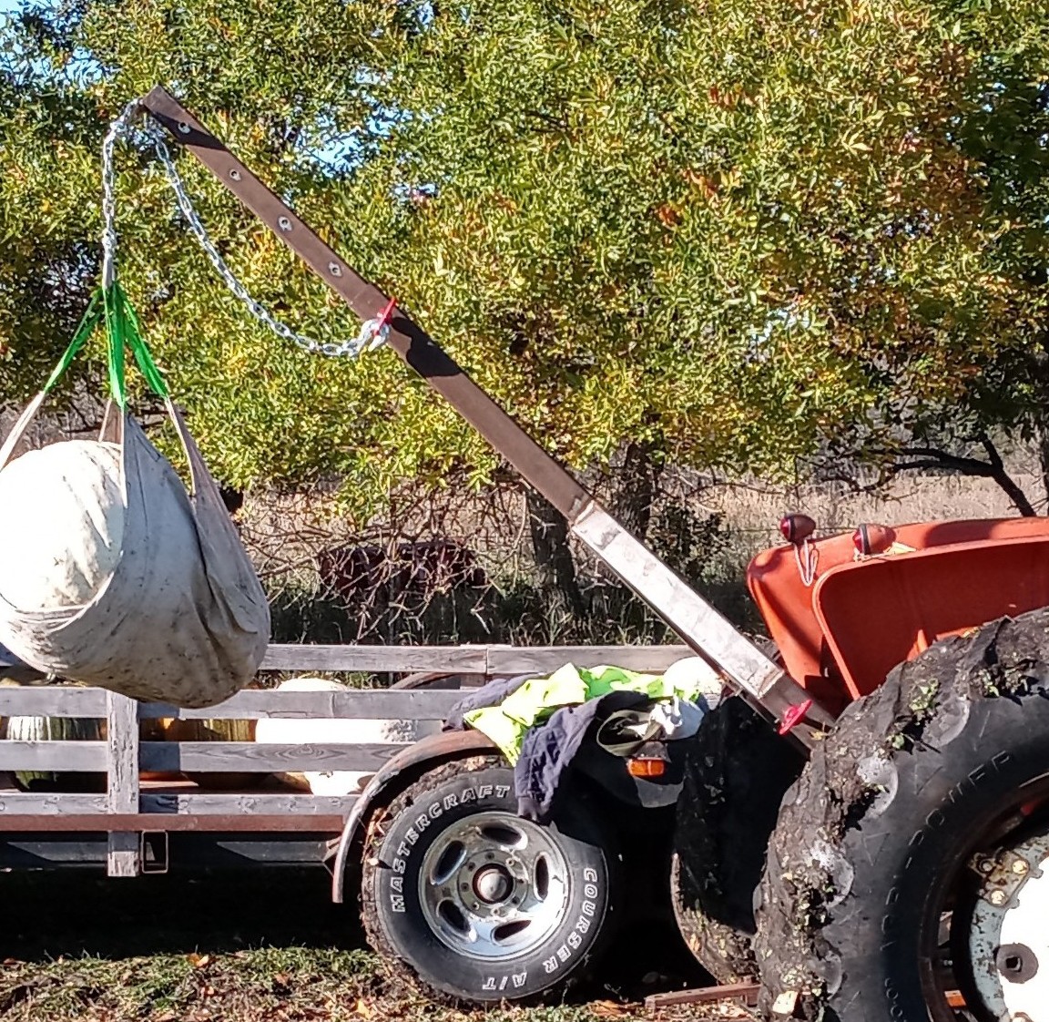 For you purists, this is definitely not original. This is my farm crane I built a couple years ago on my D17. Mostly built for getting large pumpkins out of the field. Extended fully it is all of 8' above the ground. Haven't used it for anything else, but, was able to lift my #2 3-16 plow with boom retracted. Going from memory, the tubes that slide over the lift arms are 2"x3" 1/4" wall. The telescoping boom is 2"x2"x1/4" inside of 2 1/2" x 2 1/2" x 1/4". On the end of the boom is a plate with keyhole slots so I can adjust the length of the chain. The chain has regular chain hook on one end, and choker hook on other end. The holes that pin it to the lift arms are towards the bottom of the tubes to increase lift angle.