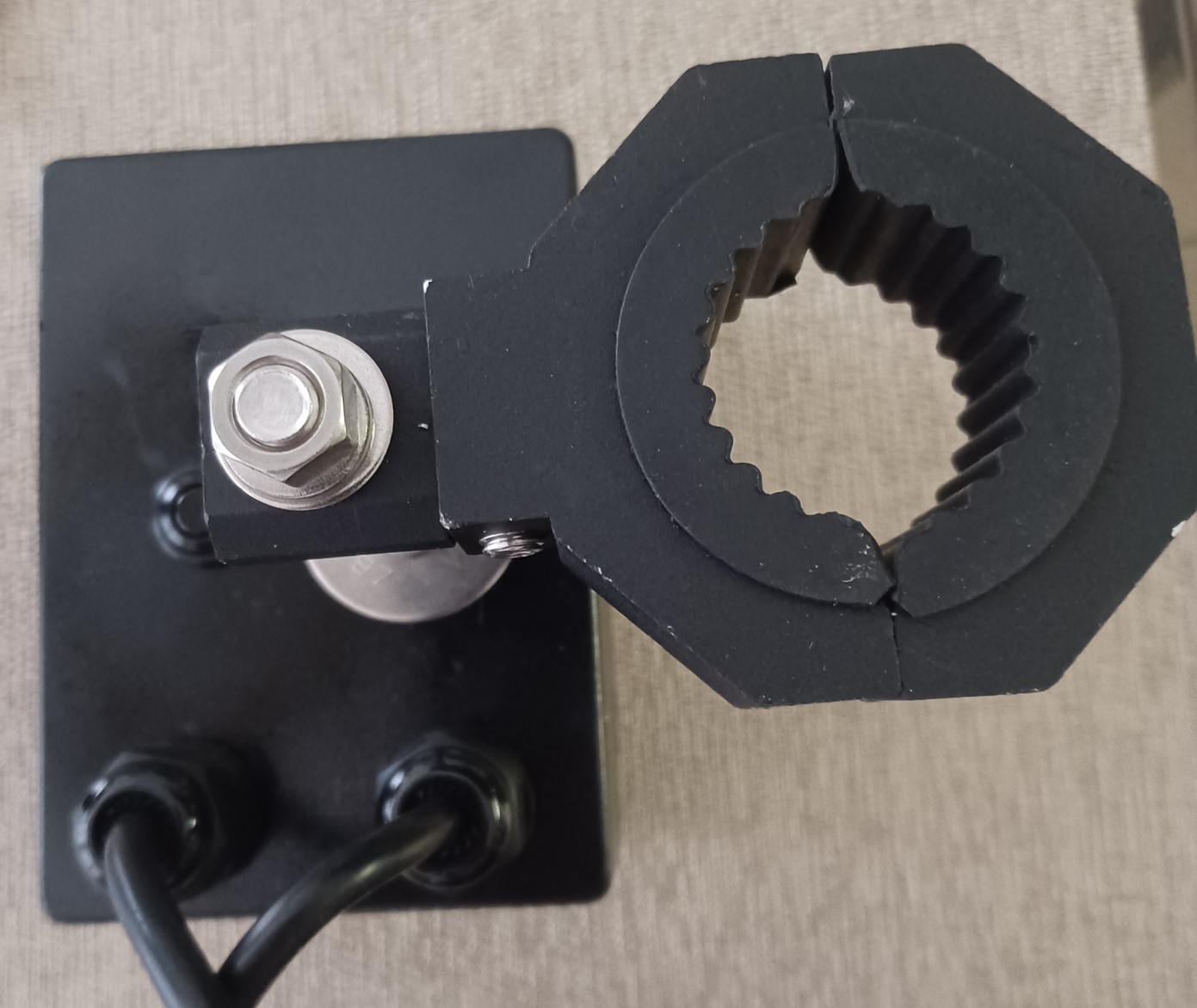 A side view of the sensor that will mount to the bottom of the bell housing through the loop in front of it (may need modifications on site).