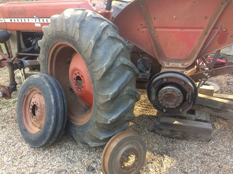 I really think my Massey dealer should help stand behind this! After only 45 years the original tires on my Dad's 135 have rotted! They won't hold air long enough to even be able to use it for 5-10 minutes. So this week she's getting 4 brand new tires and tubes, and her first brake job. I grew up on this tractor, my Dad bought it new in 1972, paid extra to have it delivered Mothers Day morning, mom wasn't amused at all! Figured I'd be nice to the tire guy and go ahead and break the beads with the hoe before taking them up to the tire place. Hopefully he will appreciate the gesture! I hate to get rid of tires with good tread but these have more holes and cracks than the government!