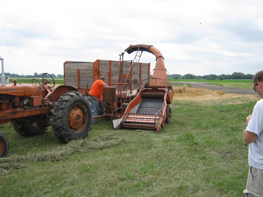 unloading. when the neighbors saw how fast we could fill a 12-14 x 30 silo. We got more requests than we had time.The man that hired us to chop his corn hauled the wagons to the silo and helped me unload. we had 3 faults front wagons. Filled the silo in one day, and topped it off the next day, plus do our own chores at home. Then move on to the next. It sure beat those IH, Papec rotary choppers. They had to remove their blades and take them to be sharpened. As to the Allis cylinder chopper we sharpened them on a regular timing so we didn't have any unusual deep worn spots. One year we grew sorghum in a new swamp area that was on a dry cycle. It grew so tall(12') we had to raise the reel on the grass attachment to reach it. The gas WD45 didn't have enough poop to run it. The dealer brought out the New WD45D to run the chopper. Harold