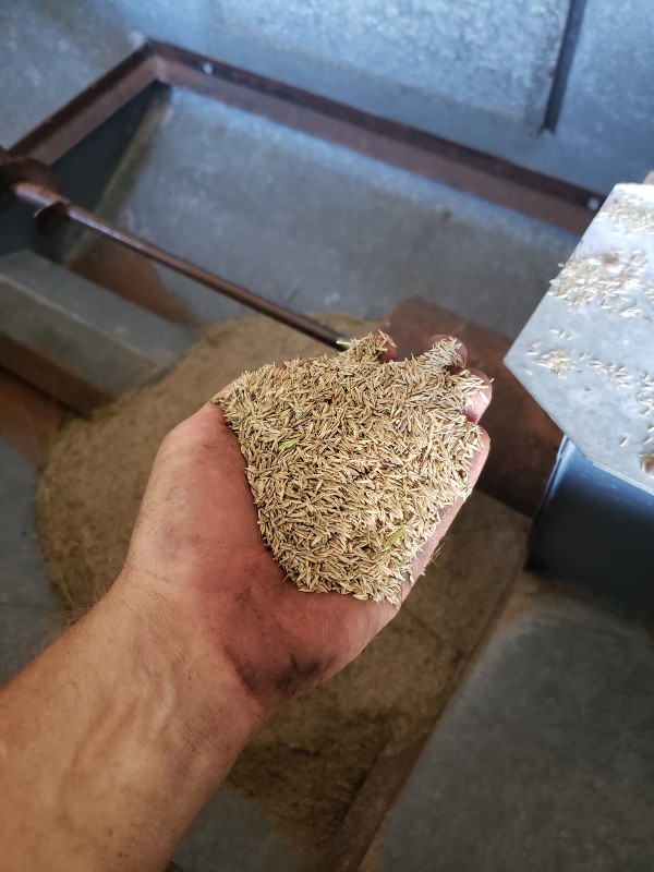 Took my A2 to the field after finishing getting it switched over from beans to fescue. Which is changing the cylinder drive sproket, putting concave bars back in. Found a bearing about to go out. Replaced it. Closed the cieve and shoe down. I was cutting in 1st gear. Dad made me speed up to 2nd gear full variable speed and this was the sample.