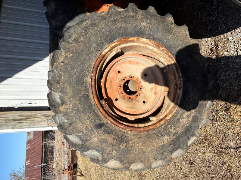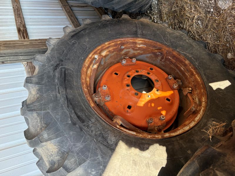 These is a set of Titan 16.9 x 28 on AC spin out rims. Tires have a bit of weather cracking and the one rim has a small patch, but would be a good usable set of tires/wheels. The rims have surface rust but would clean up nice. $850 for the pair. The wheel centers are included, the eccentrics are loose.