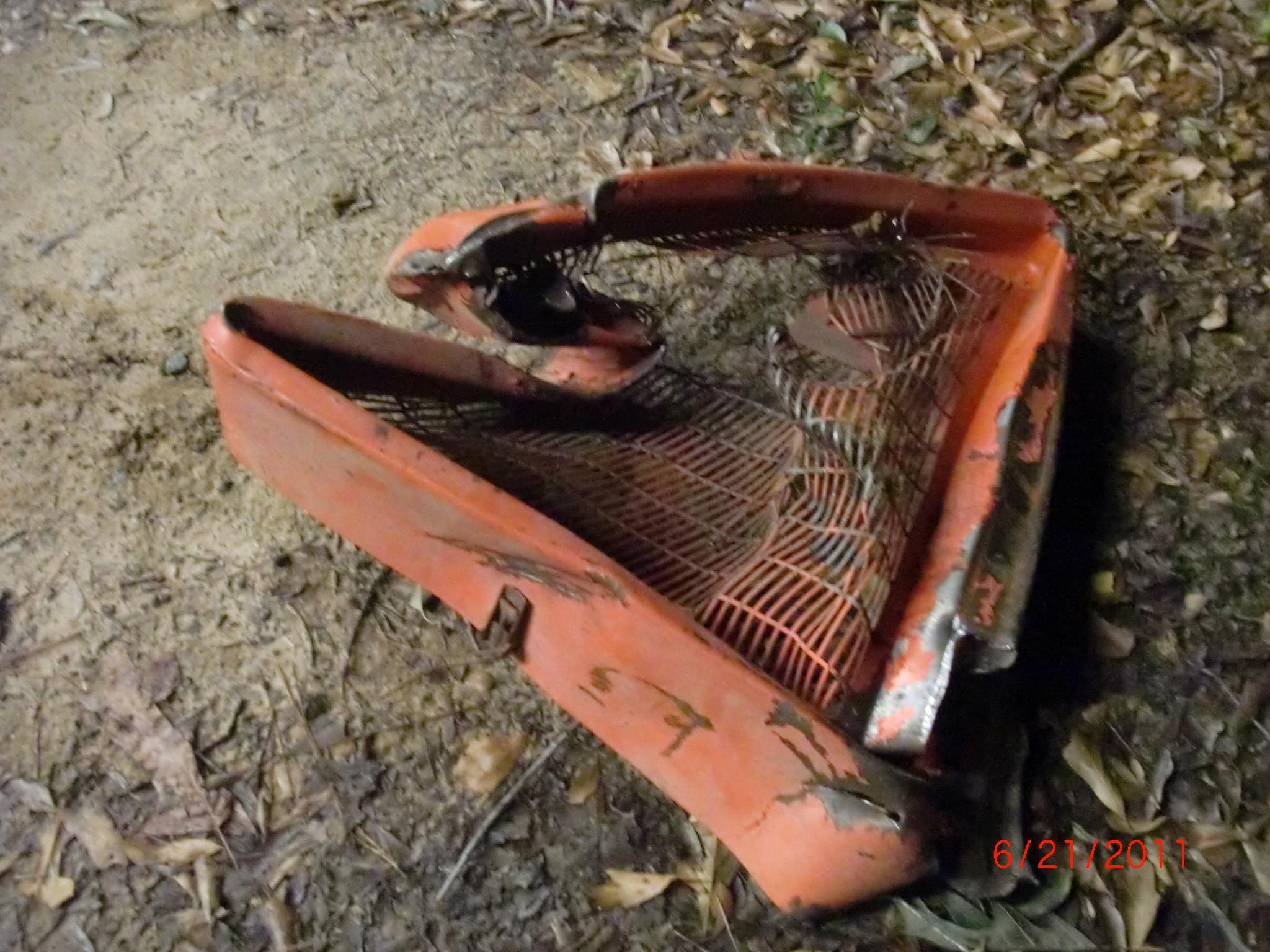 I am in need of a grille for my AC 180. I was bush hogging this evening and my grille fell off. I did not see it fall, it must have fell straight down. I heard a racket under the mower and saw an orange piece of steel. I was like, "What the...?". When I got off and investigated, this is what I found.